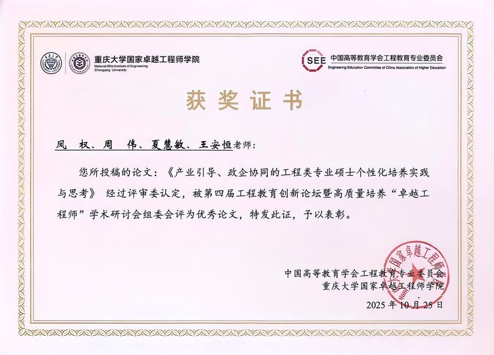 我校卓越工程师培养成果《产业引导、政企协同的工程类专业硕士个性化培养实践与思考》阐述的人才培养模式、机制与观点获得与会专家认可,被会议组委会评定为优秀论文。