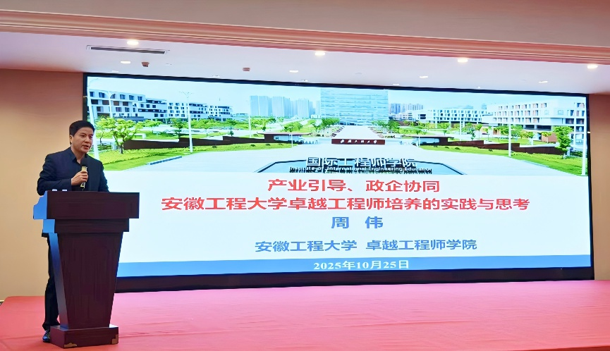 本此会议旨在打造具有中国特色的工程教育创新局面,促进工程教育教学改革,加快探索卓越工程师培养模式变革。周伟做了题为《产业引导、政企协同安徽工程大学卓业工程师培养的实践与思考》的主题报告。报告从研究背景、工程类专业硕士培养实践探索、高质量培养路径思考等角度,分享了安徽工程大学卓越工程师学院在人才培养方面的举措和经验。